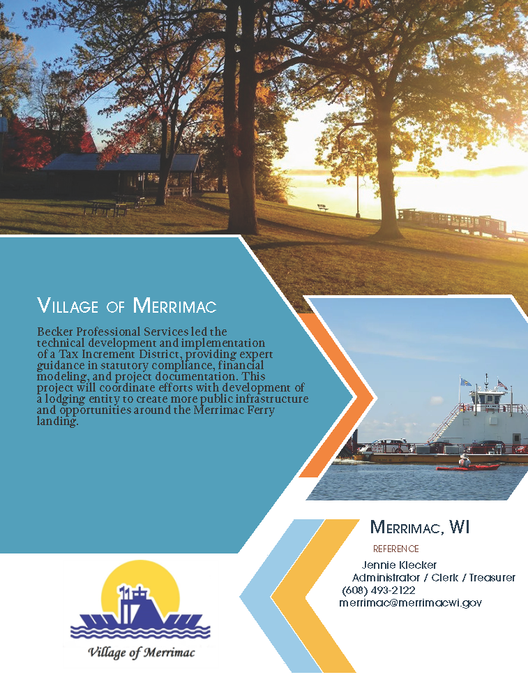 Creation of a Tax Increment District (TID) for the Village of Merrimac, delivering specialized planning and economic development expertise to support long-term infrastructure investment, financial modeling, and statutory compliance.